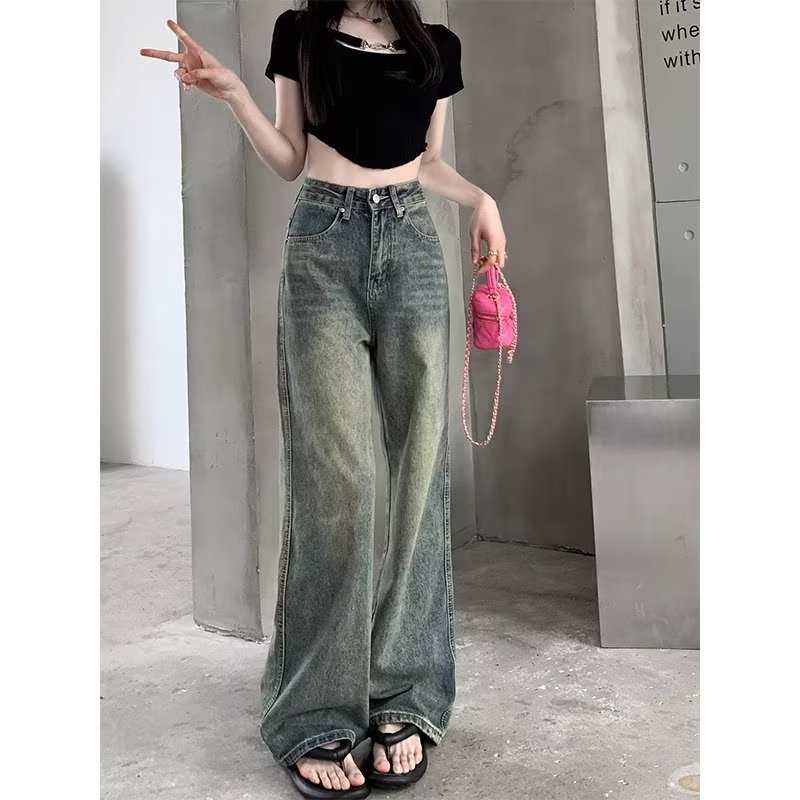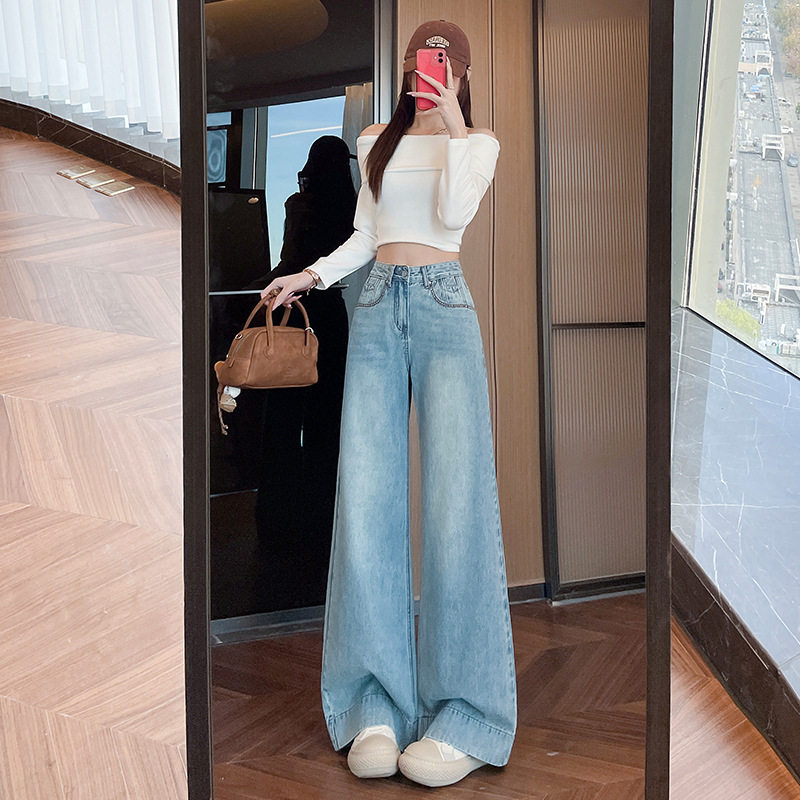 Celana Jeans Dicuci Air Retro Warna Biru Muda Celana Weibe Selangkangan Tinggi Lurus Merek Trendi Musim Semi Musim Gugur Celana Panjang Kecil Kaki Lebar Longgar