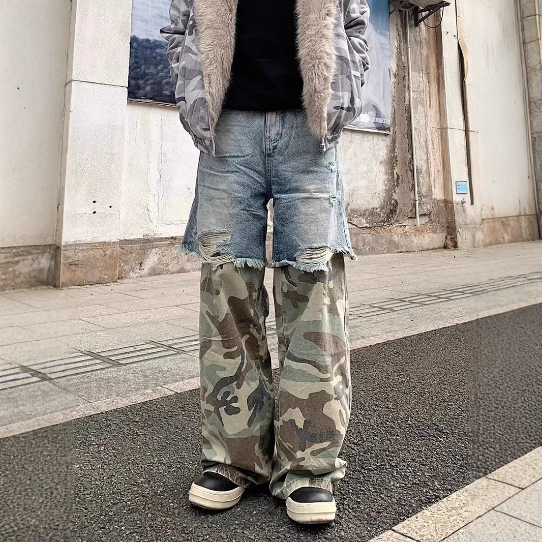 Celana Jeans Kamuflase Kombinasi Retro Gaya Eropa Amerika Celana Panjang Pria Kaki Lebar Longgar Dicuci Niche Jalanan Merek Populer VIBE