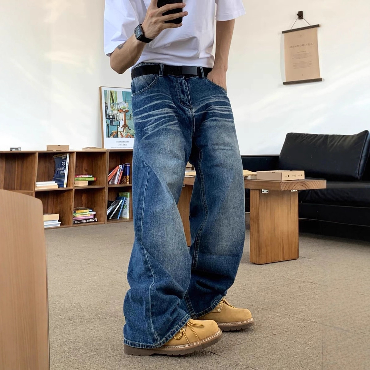 American street retro vintage niche jeans sederhana pria dicuci longgar mengepel kasual klakson mikro panjang
