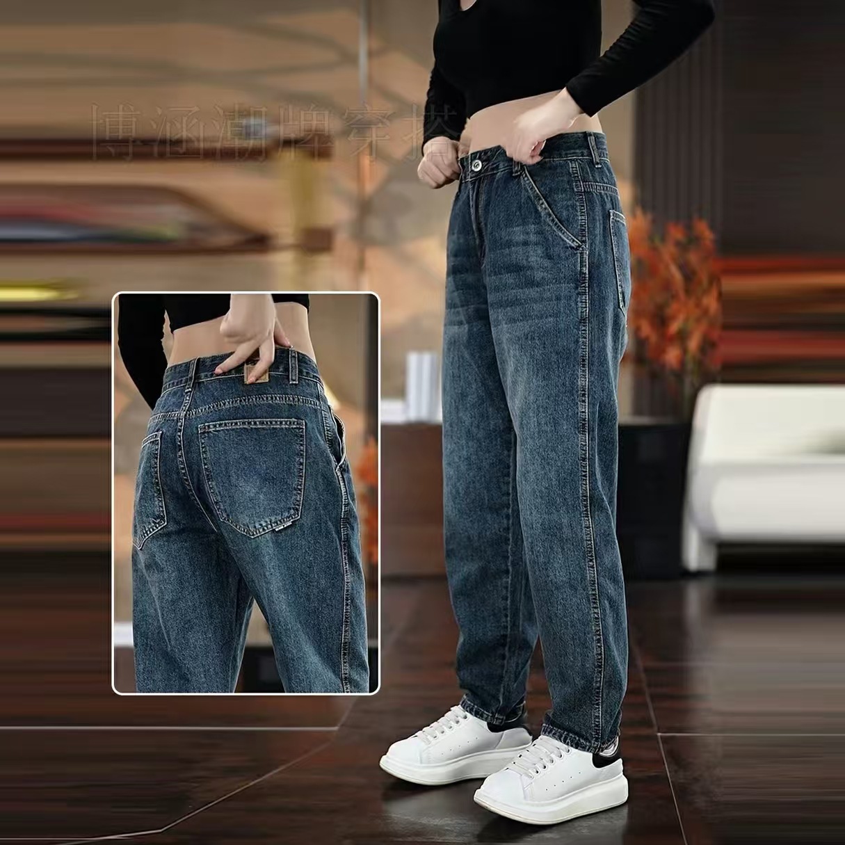Celana jeans ukuran besar wanita, celana harem ramping tebal kaki lebar melar mm200 kg longgar lemak ukuran besar