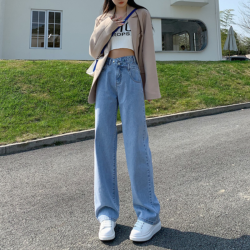 Celana panjang kaki lebar untuk wanita, celana Jin kasual elegan gaya Korea pinggang tinggi lurus longgar pelangsing musim panas dan semi