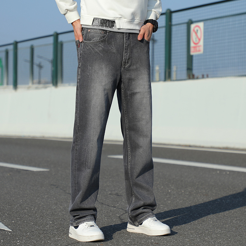 Celana jeans lurus longgar model regular tahun 2025 untuk pria, warna abu-abu, ukuran besar, bahan elastis, pakaian pria vintage dengan efek distressed.