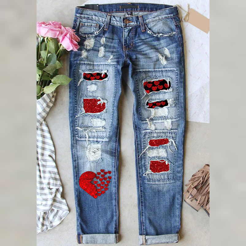 Jeans bercetak hari Valentine wanita, celana kasual setengah pinggang Eropa dan Amerika perdagangan luar negeri ukuran besar 2023