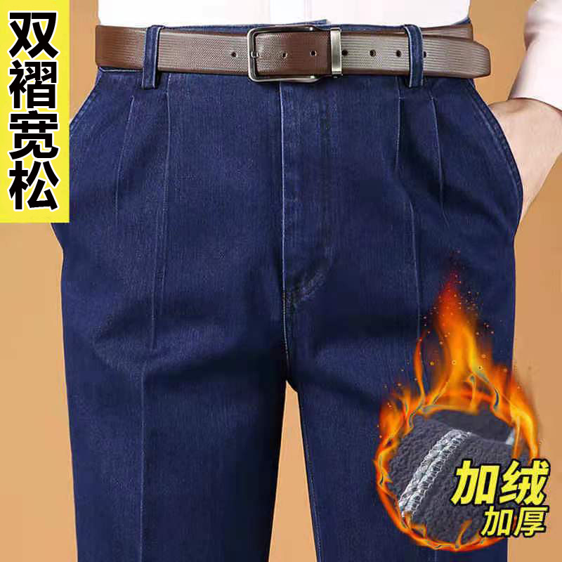 Jeans pria setengah baya dan lansia, celana jeans pinggang tinggi berlipat ganda, celana lurus longgar dipertebal musim dingin