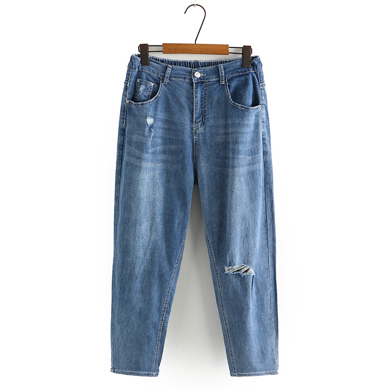 Celana wanita ukuran besar, celana jins kasual serbaguna wanita, celana potong robek, kuas, pelangsing, tipis, musim panas, ukuran besar, 496324