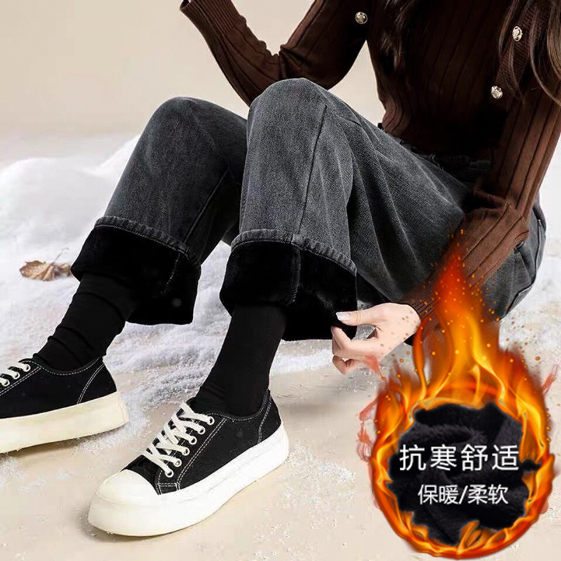 Celana jeans lurus berlapis bulu untuk wanita, musim gugur dan musim dingin, potongan longgar, ukuran besar, melangsingkan, jatuh, ukuran kecil, celana lebar sempit