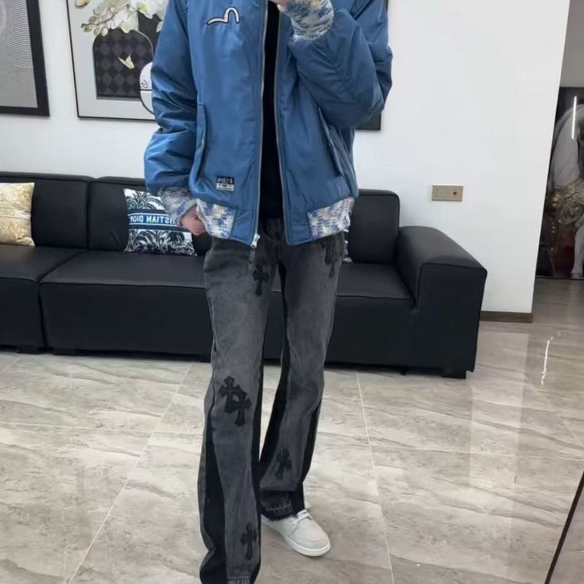 Celana Jeans Celana Merek Trendi Mikro-La Lurus Bordir Pencucian Air Silang Sambungan Santai Jalan Tinggi Otonomi Gaya Amerika