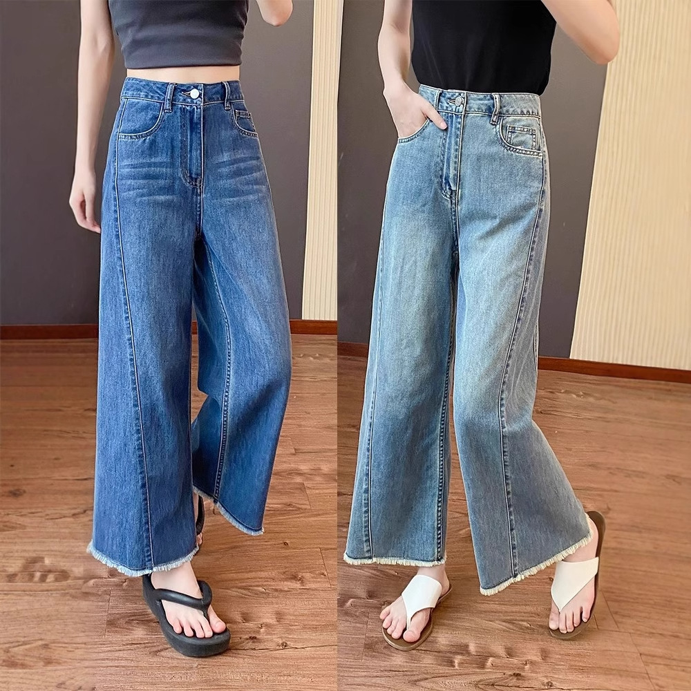 Celana Kasual Wanita Mudah Dipadu Padan Gaya Korea Kaki Lebar Longgar Model Tipis Musim Panas Celana Lurus Denim Ukuran Besar Katun Dicuci Air Terlihat Langsing Pinggang Tinggi