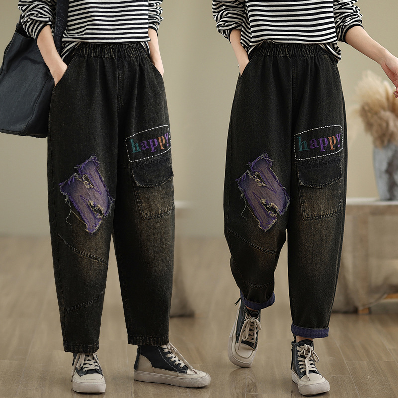 实拍 大码文艺复古贴布磨破牛仔裤秋季新款宽松显瘦哈伦裤老爹裤