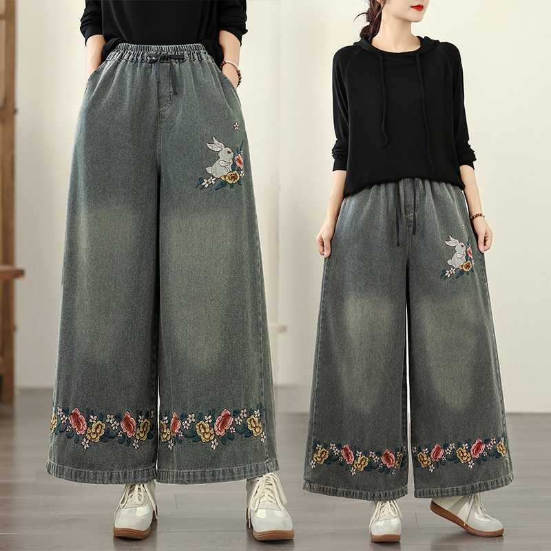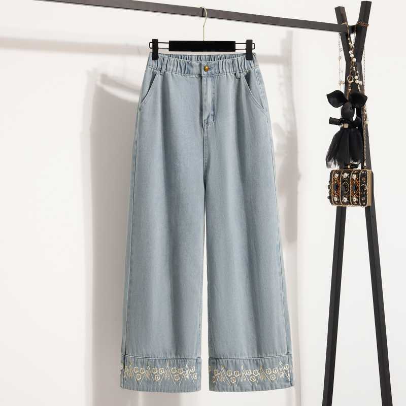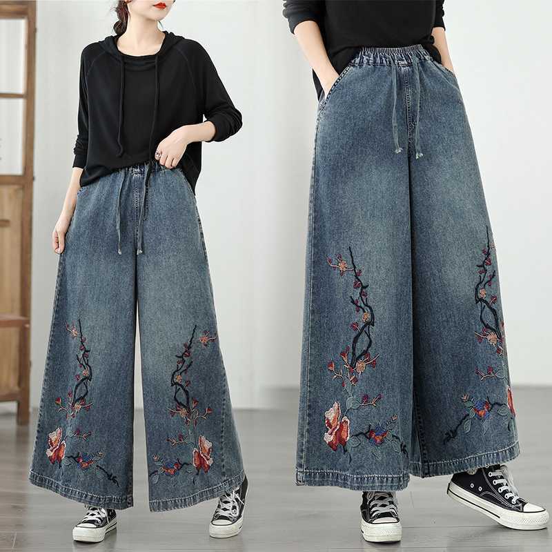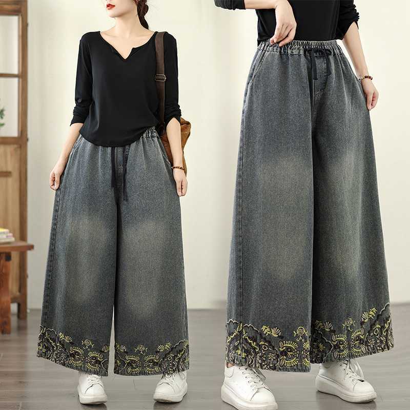 Foto Produk Solid Celana Kaki Lebar Ukuran Besar Pinggang Elastis Gaya Etnik Bordir Industri Berat Denim Lembut Model Tipis