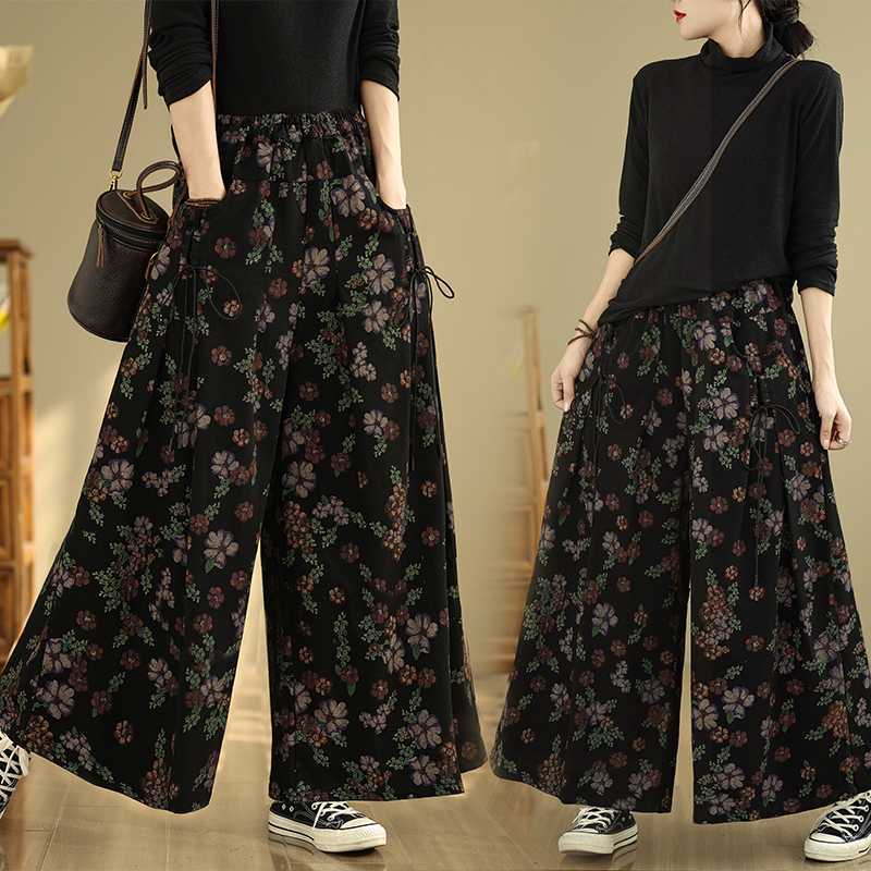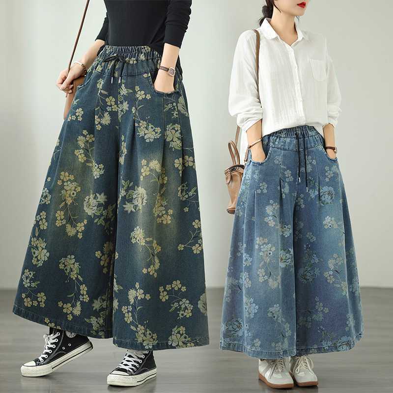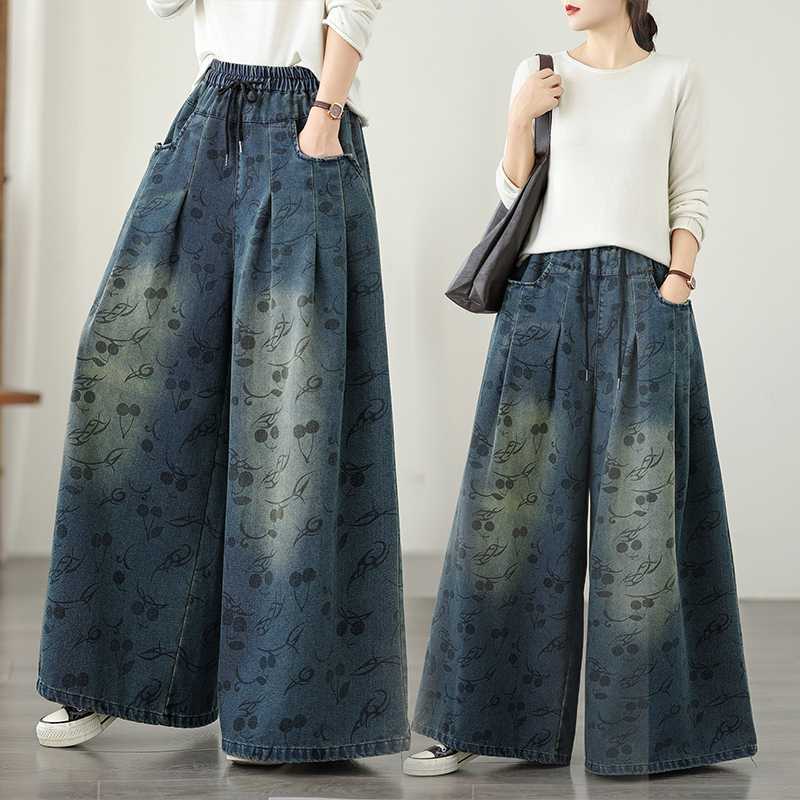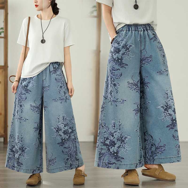 Foto asli Barang Tersedia Musim Panas Model Tipis Denim Penuh Cetak Bunga Celana Kaki Lebar Longgar Terlihat Kurus Pinggang Elastis Celana Wanita