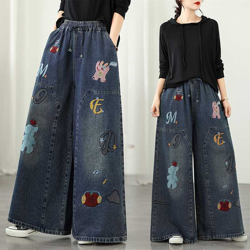 实拍秋款软牛仔复古重工卡通刺绣松紧腰百搭休闲大码阔腿裤