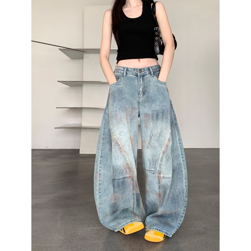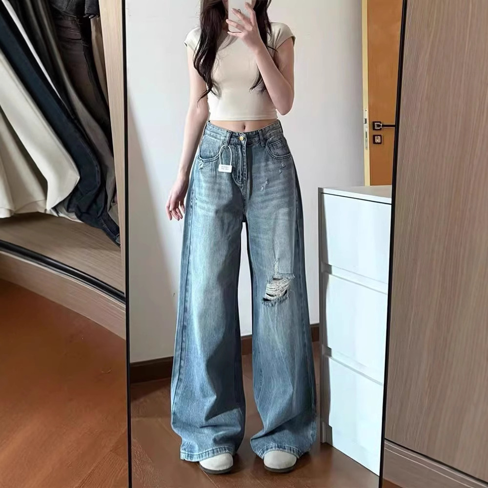 Celana Panjang Kaki Lebar Terlihat Ramping Longgar Jalanan Wanita Celana Jeans Pisau Gosok Kotor Tua Dicuci Air Ukuran Besar Foto Padat