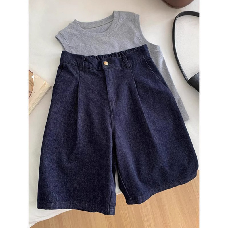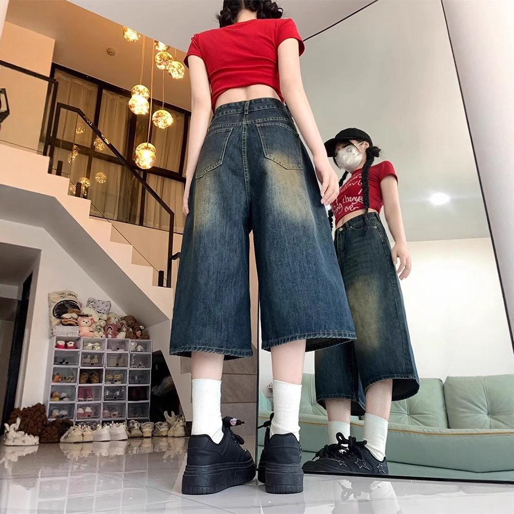 Celana Pendek Lurus Longgar Terlihat Ramping Ukuran Besar Pinggang Tinggi Musim Panas Wanita Celana Denim 7/8 Kaki Lebar Retro Gaya Amerika