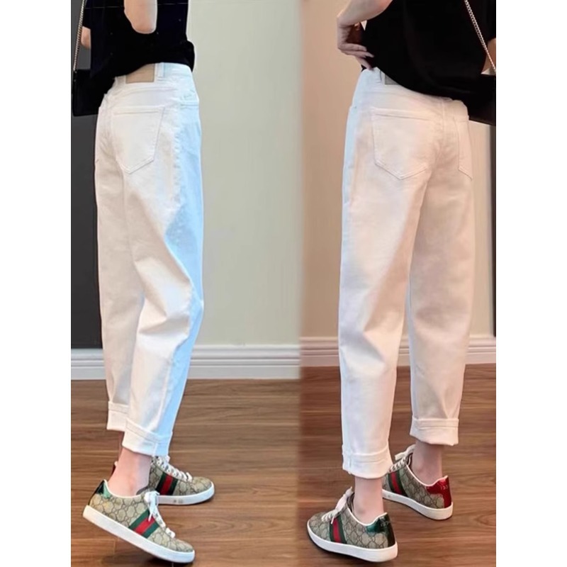 Celana Jeans Harem Celana Ayah Sembilan Poin Warna Putih Ukuran Besar Bentuk Pir Longgar Terlihat Langsing Pinggang Tinggi Model Baru Musim Semi Musim Panas 2025 Wanita