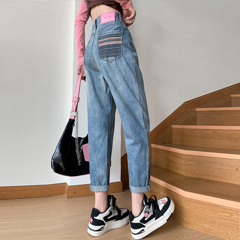 Celana Jeans Stempel Bunga Empat Daun Retro Wanita Tahun 2024 Musim Semi dan Musim Gugur Longgar Ukuran Besar Jahitan Jahitan Jahitan