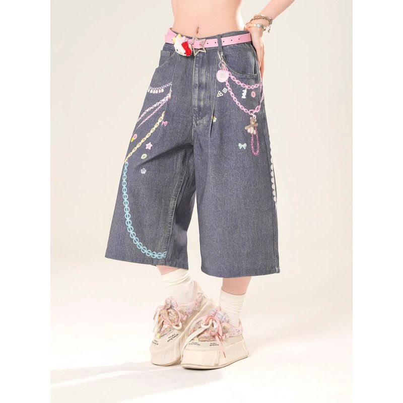 Celana Jeans Bordir Ular Merah Desain Berat Gadis Ukuran Besar Gaya Amerika Celana Pel Kaki Lebar Retro Subkultur Anak-anak