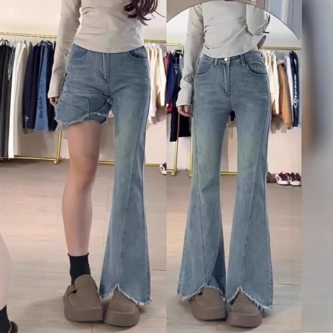 Celana Jeans Wanita Warna Biru Muda Pinggiran Bercabang Kecil Celana Terompet Menutupi Elastis Pinggang Tinggi Terlihat Langsing Ukuran Besar Wanita Gemuk Model Baru