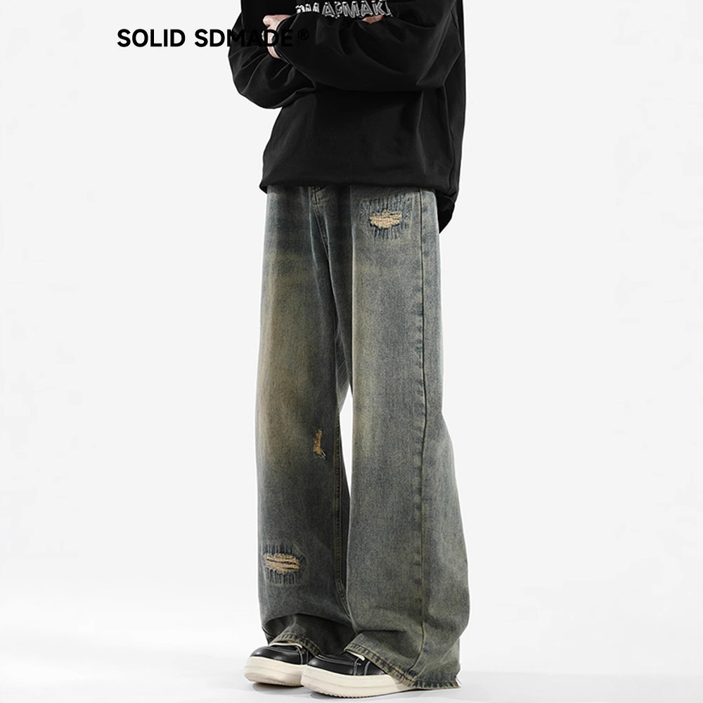 Celana Jeans Berlubang Gaya Amerika Celana Lebar Kaki Mudah Dipadu Padan Terlihat Langsing Gaya Jalan Tinggi Longgar Lurus Musim Panas Dicuci Pria