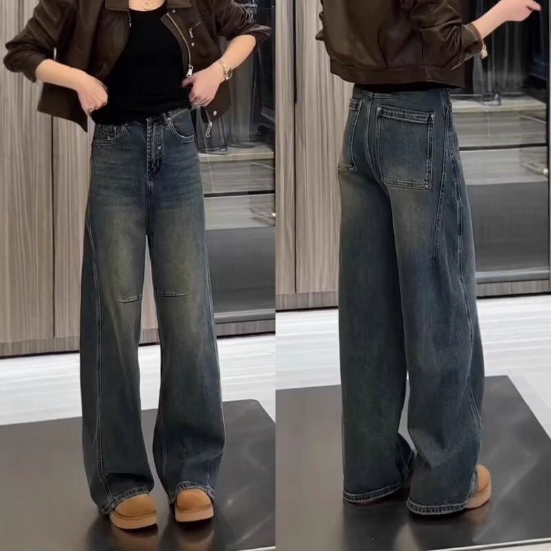 Celana Jeans Lurus Pinggang Tinggi Wanita Celana Melepuh Kaki Lebar Terlihat Langsing Longgar Kasual Gaya Terjatuh Malas Model Baru Musim Gugur