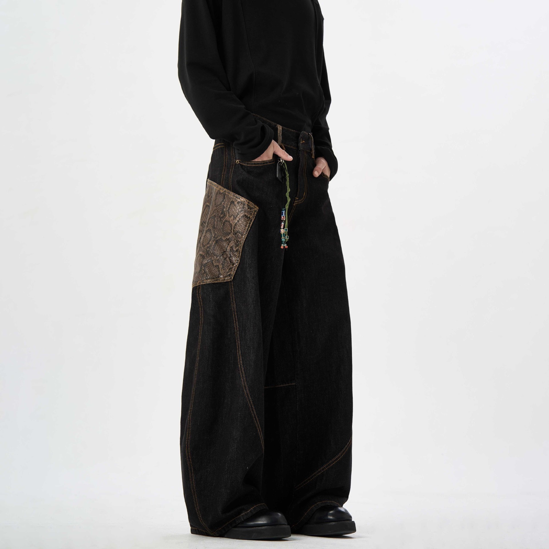 Celana Jeans Sabrang Warna Hitam Retro Amerika Celana Lebar Kaki Lurus Longgar Saku Besar Saku Besar Gaya Desain Musim Semi 2025 Wanita