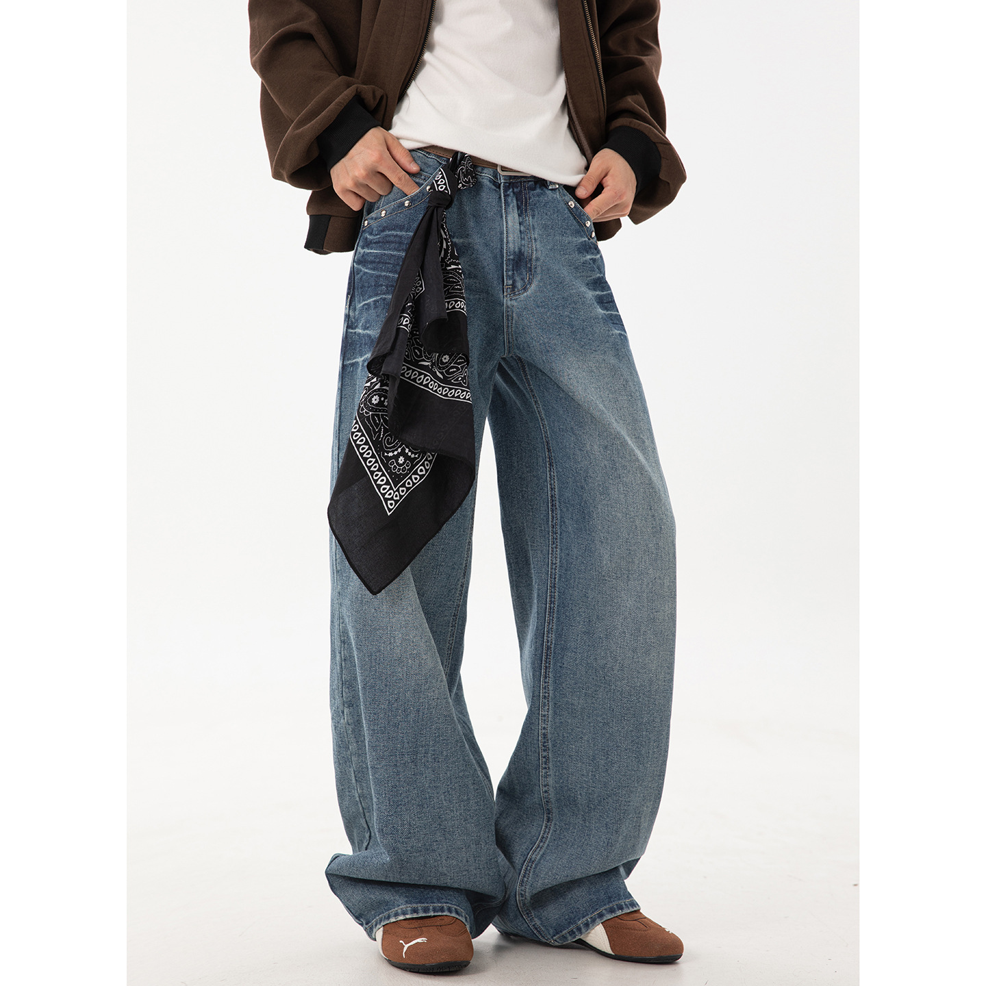 Celana Kasual Kaki Lebar Pisau Golok Model Longgar Pria Wanita Celana Kasual Paku Keling Retro Jalan Tinggi Gaya Amerika Serbaguna