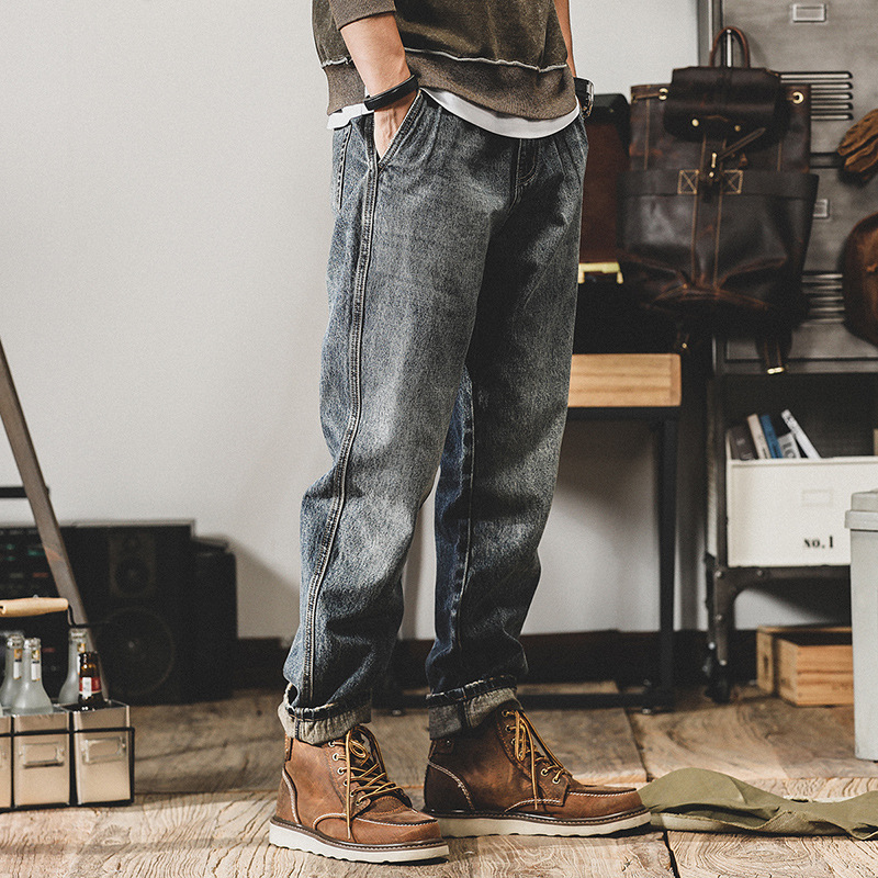 Celana jins ketat pria, jins gaya Amerika, celana lurus longgar, ukuran plus, celana musim semi dan musim gugur pria kaki lebar