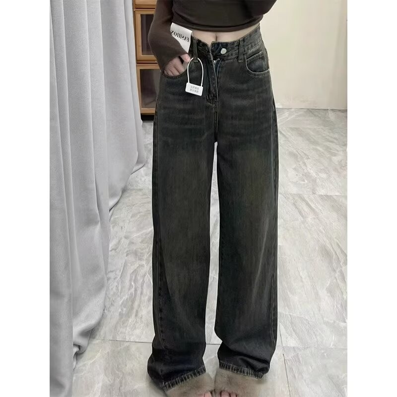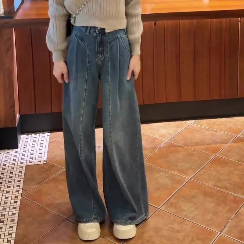 Celana Jeans Retro Menutupi Kaki Lebar Wanita Musim Semi 2025 Model Baru Bentuk Buah Pir Ukuran Besar Terlihat Langsing Celana Melepuh