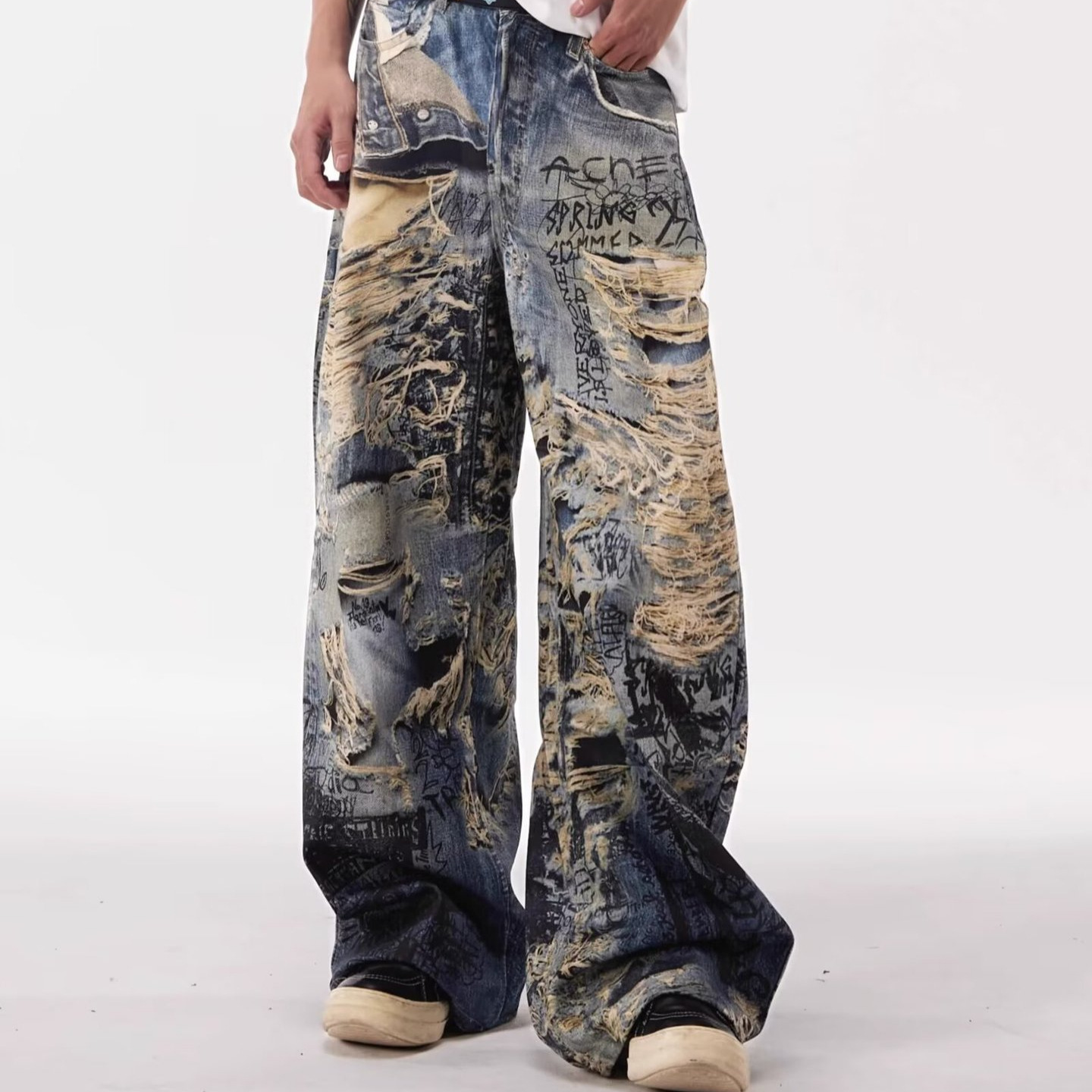 Celana jins robek jalanan goreng berat perdagangan luar negeri pria gaya Eropa dan Amerika celana ramping erosi lurus Amerika daftar perdagangan luar negeri