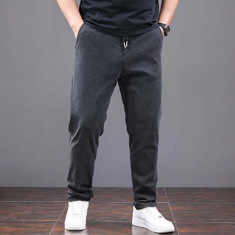 Celana jins pria ukuran besar, celana Denim lurus Semua cocok bisnis meregang longgar bergaris bulu domba baru musim dingin ukuran besar