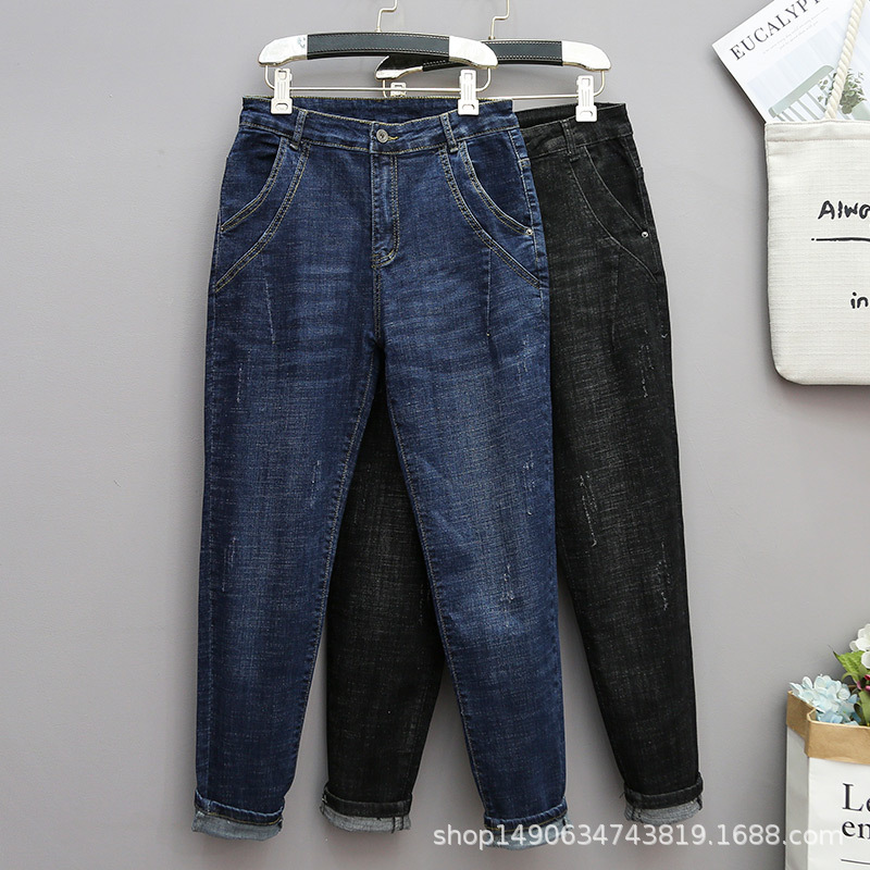 Celana jeans ukuran besar wanita, celana panjang regang gemuk, pakaian musim dingin pinggang tinggi ukuran besar baru