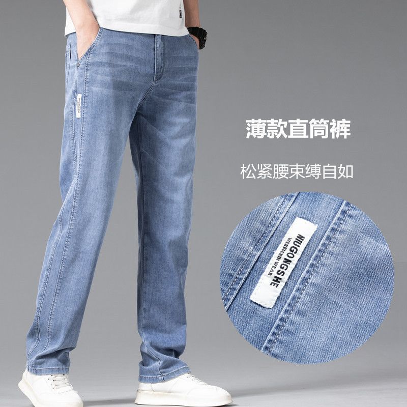 Celana Jeans Lurus Katun High-end Tipis Celana Panjang Pria Mudah Dipadu Padan Santai Longgar Celana Kasual Elastis Tahan aus Model Baru