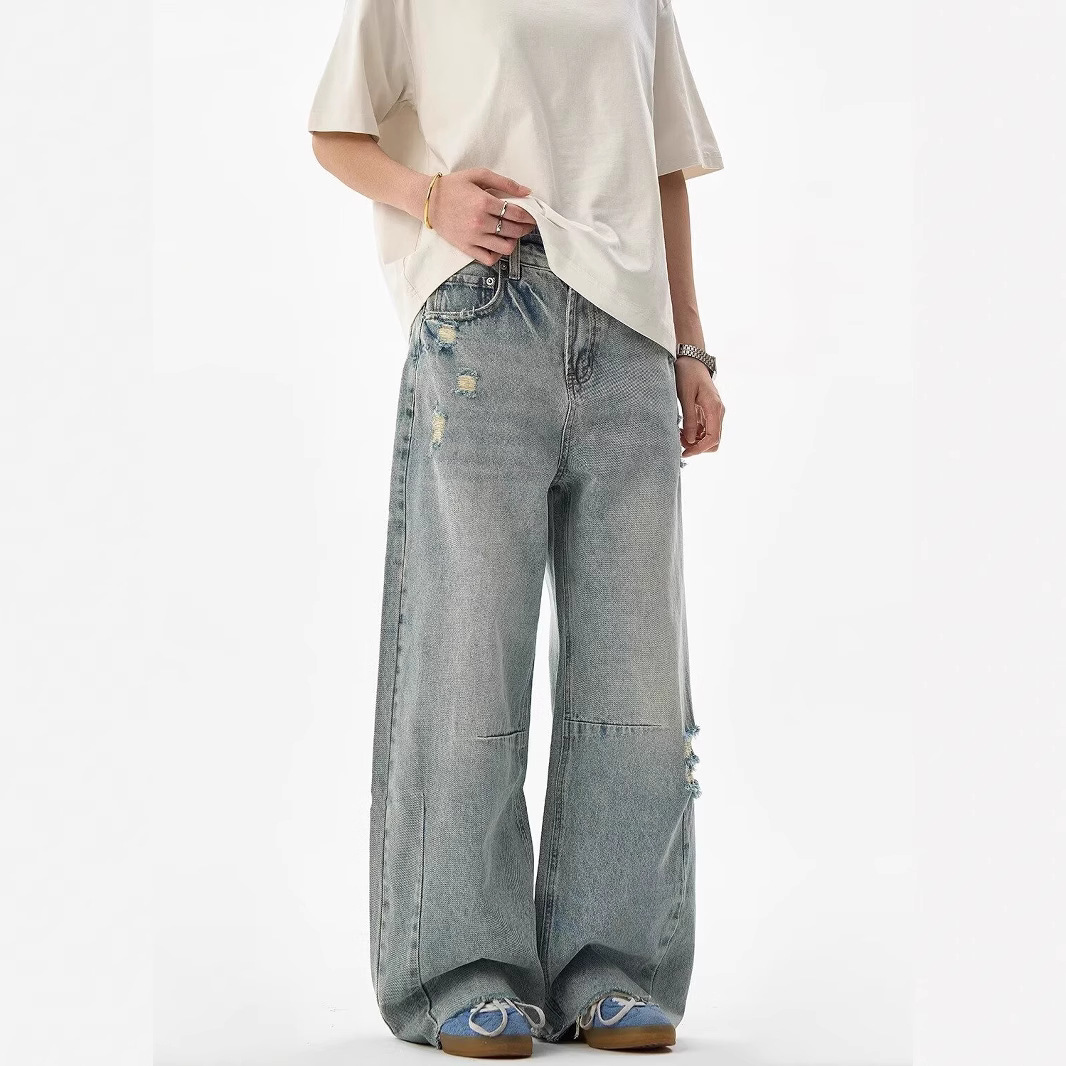 Celana Jeans Pria Berlubang dengan Kaki Lebar Longgar Celana Melepuh Pria dengan Sabrang yang Dicuci Air