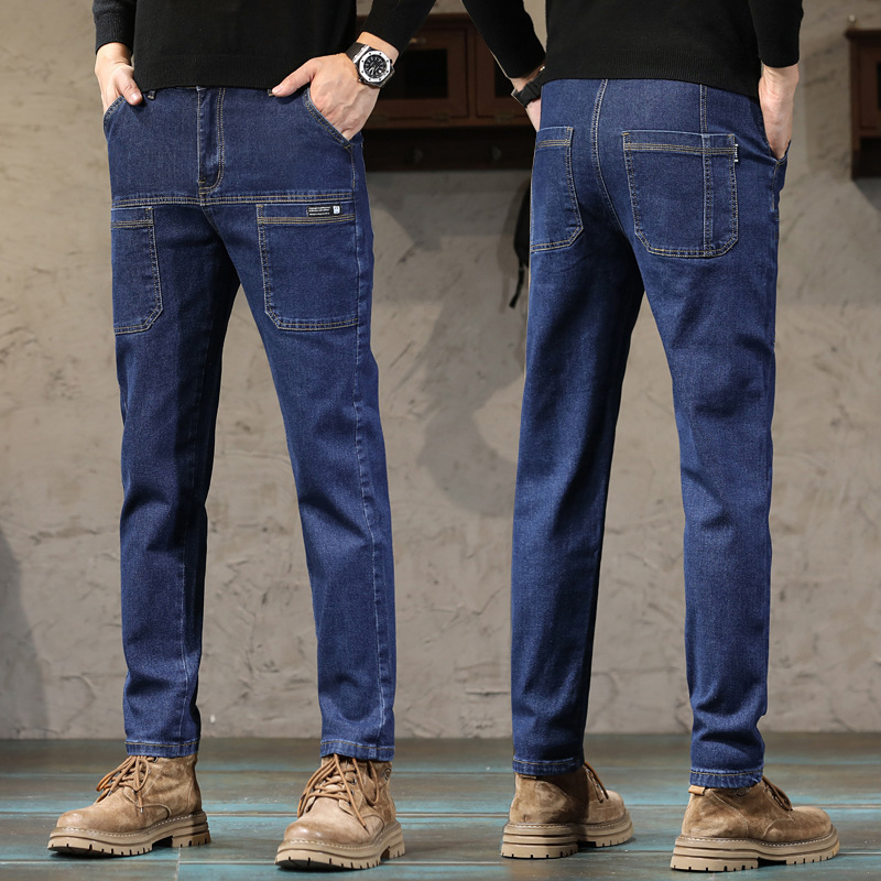 Celana jins pria, celana jins musim dingin, celana panjang lurus longgar, celana bisnis pria, celana jins setengah pinggang, tebal, hangat, untuk musim dingin