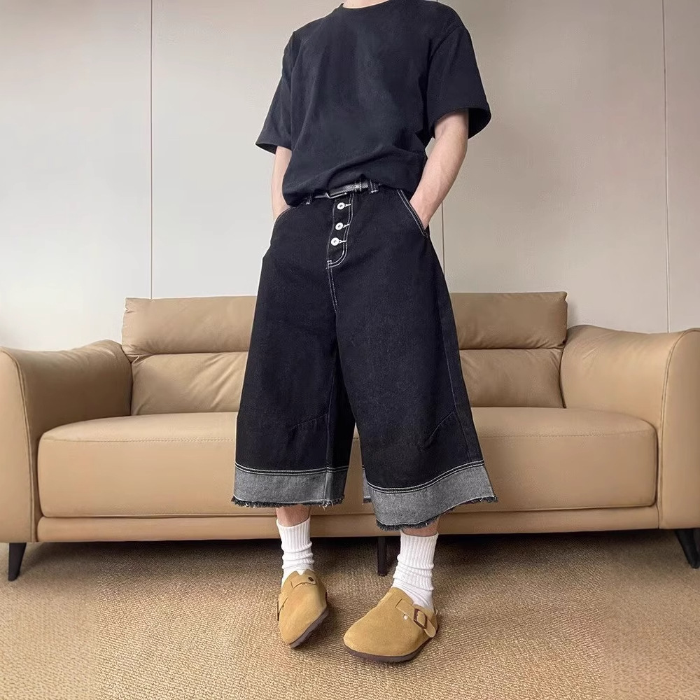 Pabrik Penjualan Langsung Celana Denim Pinggir Wol Jahitan Mencuci Warna Kontras Celana 7/8 Pria Longgar Banyak Kantong Musim Panas 2025