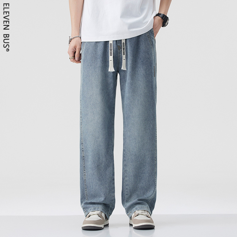 Celana Jeans Warna Biru Muda Model Pria Musim Semi Musim Gugur Celana Lurus Longgar Pinggang Elastis Tali Serut Celana Gaya vibe Jalan Tinggi Gaya Amerika