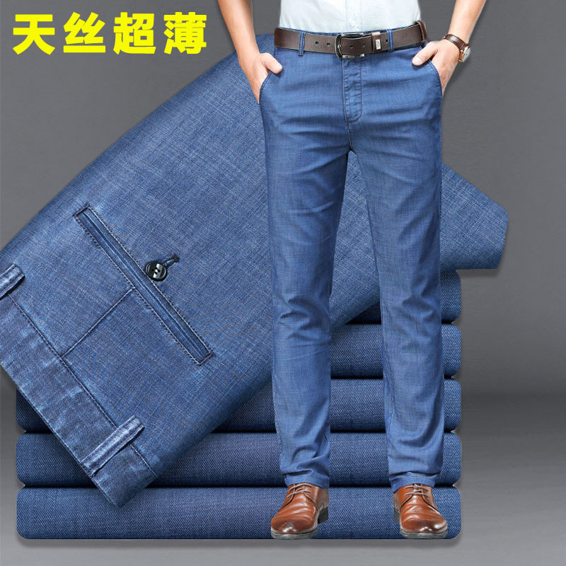 Jins sutra es perisai emas musim panas pria, jeans Lurus ultra tipis pinggang tinggi selangkangan dalam longgar kasual anti Keriput untuk Ayah paruh baya
