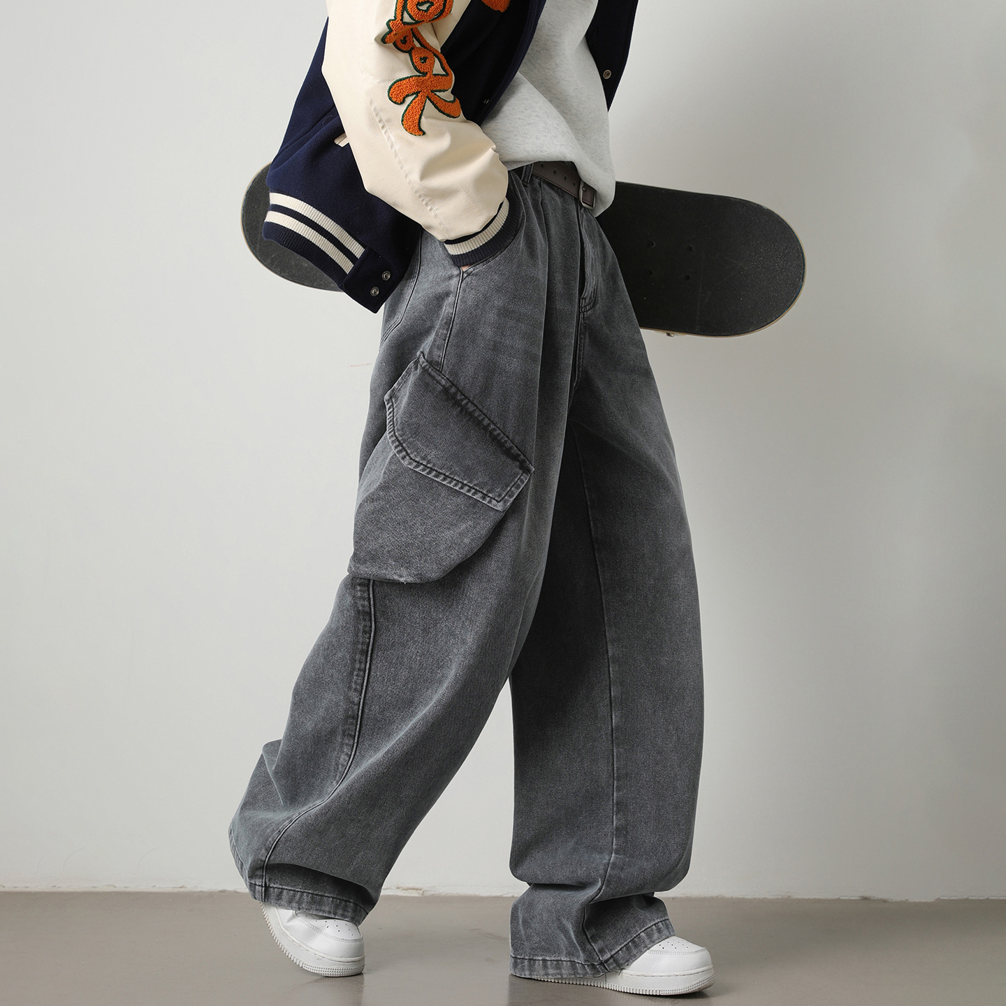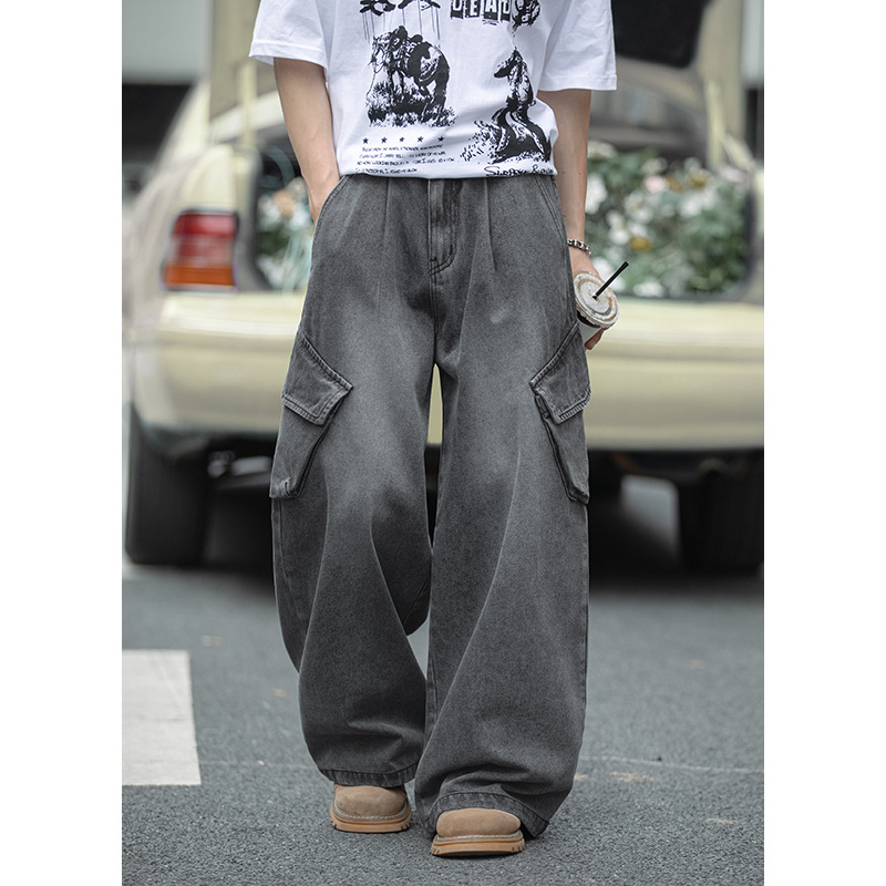 JIAMU Jeans Bag Jeans Gaya Uang Asli Asli Gaya Amerika Pria Kaki Lebar Lurus Netral Longgar
