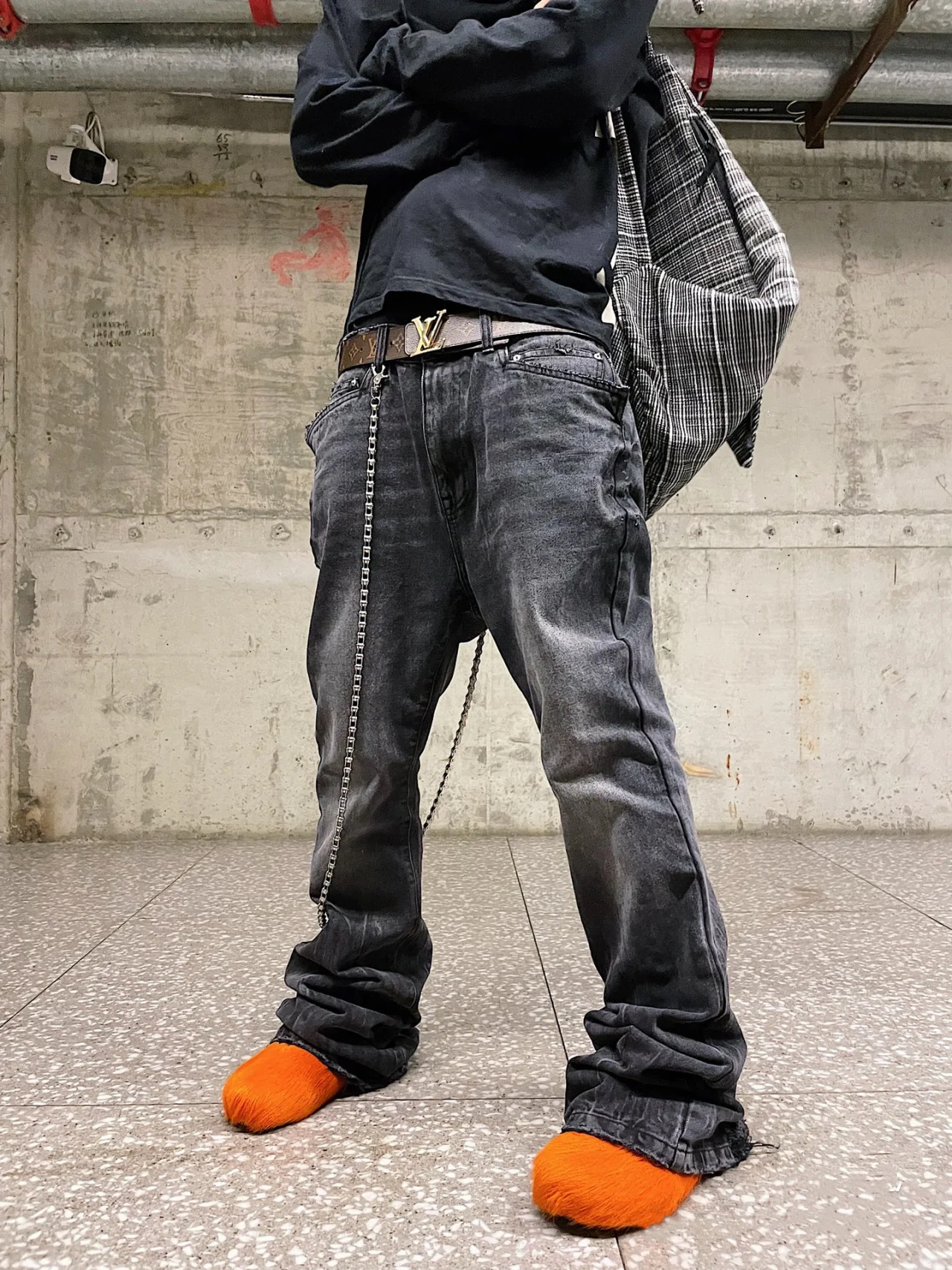 Jins kasual gaya Amerika, celana jins kasual jalanan tinggi pria dan wanita, tanduk mikro cacat, hitam dan abu-abu, celana gaya sama 91