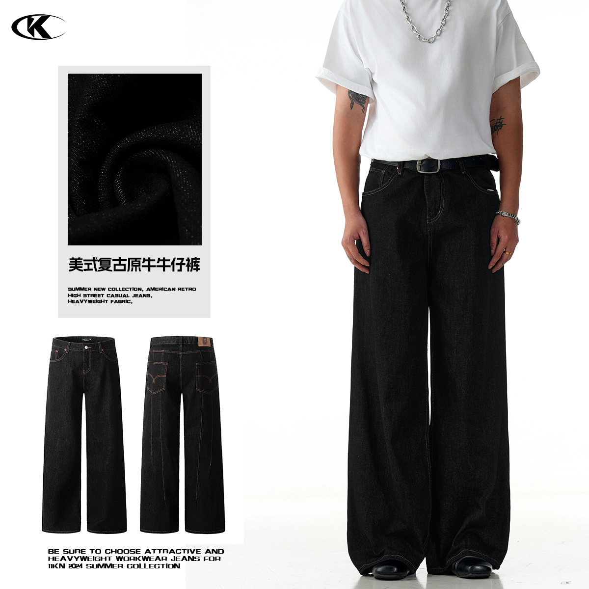 Jeans hitam gelap gaya Amerika 11KN untuk pria dan wanita, celana lebar kasual cleanfit sederhana yang melangsingkan kaki lurus longgar