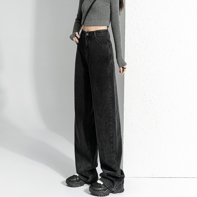 Celana jins lurus kaki lebar pinggang tinggi hitam abu-abu wanita baru musim gugur celana pel longgar perempuan populer di musim semi dan musim gugur