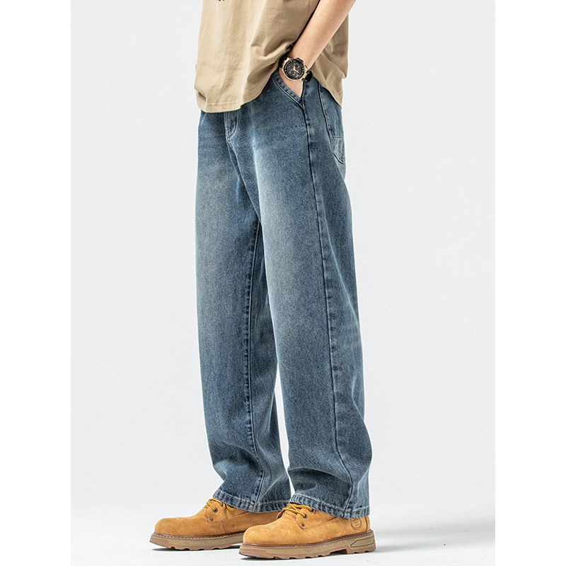 Celana jins longgar kaki lebar pria, celana jins ayah ukuran besar retro Jepang musim semi dan musim gugur longgar netral kasual