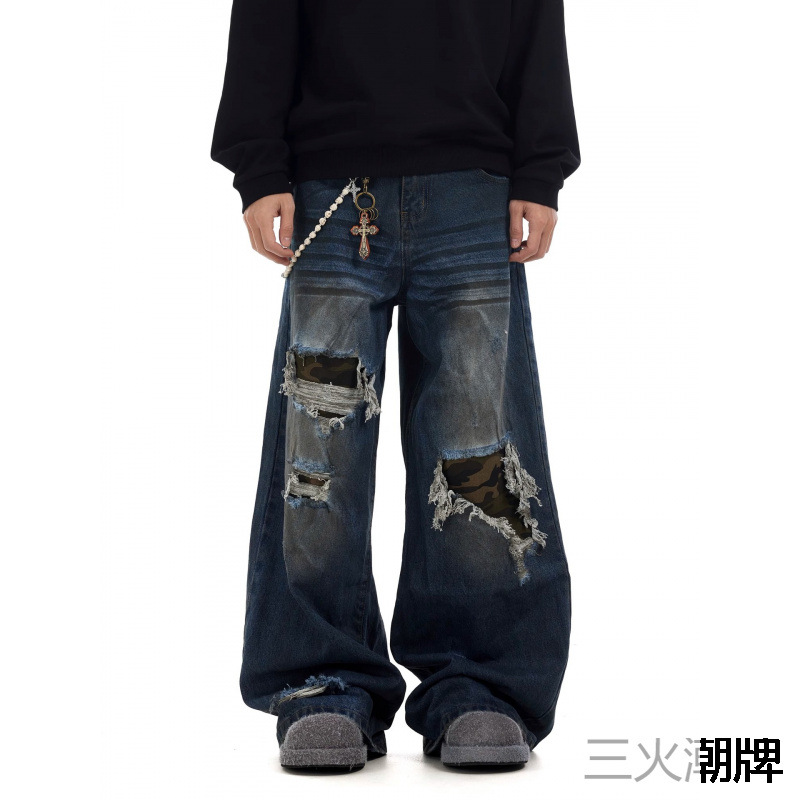 Celana Jeans Kamuflase Patch Berlubang Retro Gaya Amerika Celana Panjang Pria Longgar Kaki Lebar Gaya Senior Niche