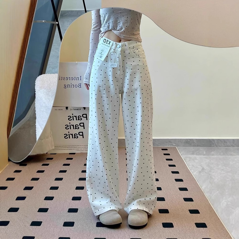 Celana Jeans Bunga Polk Warna Putih Ukuran Besar Celana Kasual Longgar Lebar Kaki Lurus Pinggang Tinggi Gaya Desain Musim Panas Wanita Trendi
