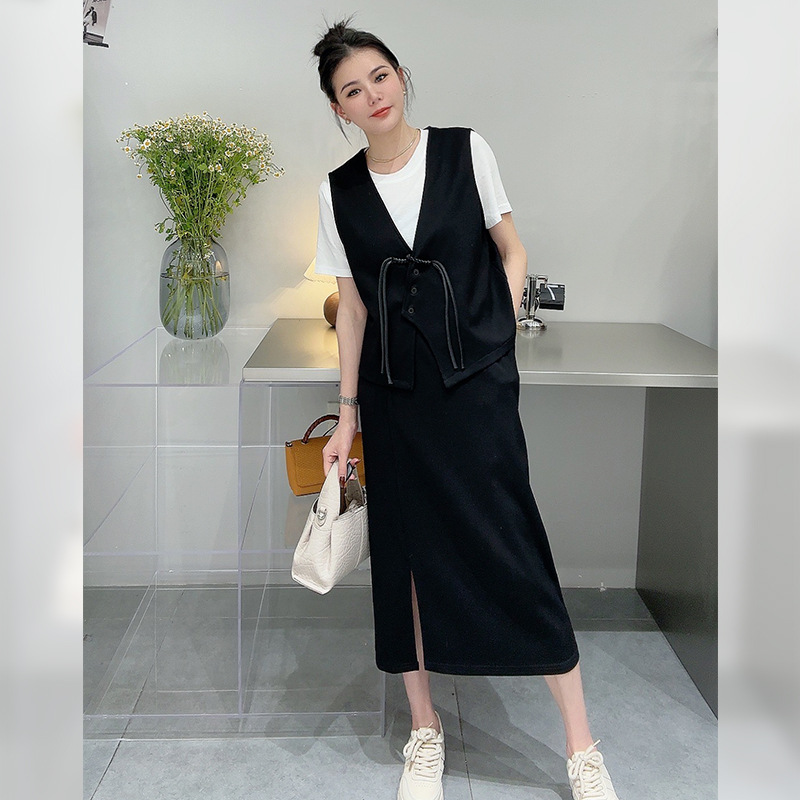 Rok Setelan Usia Mengurangi Usia Warna Hitam Elegan Model Baru Musim Panas 2025 Rok Setengah Badan Lengan Pendek Terlihat Langsing Kasual Modis Set Dua Potong Wanita