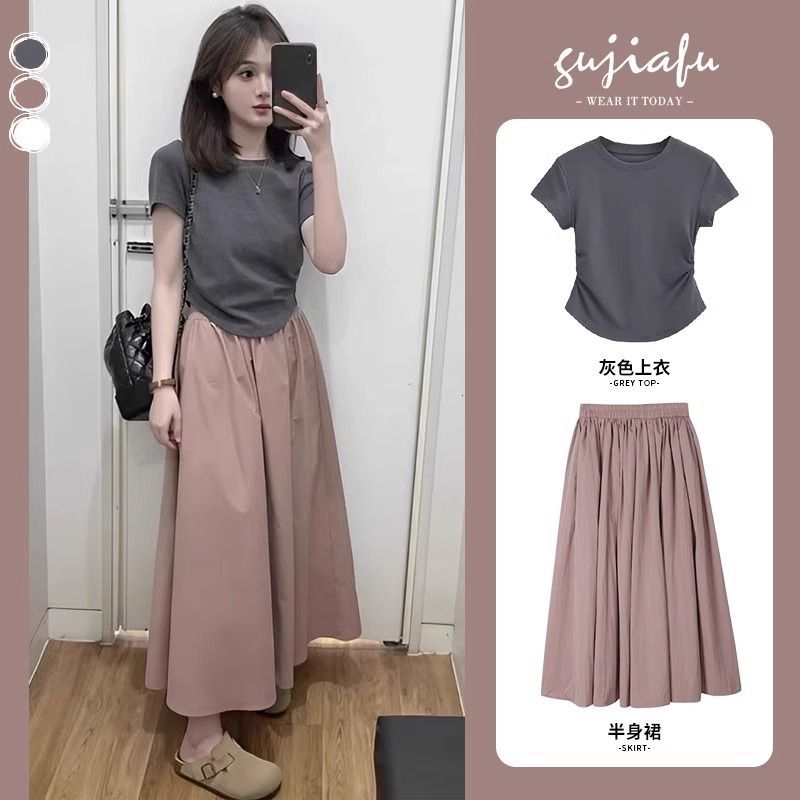 Setelan Kasual Modis Musim Panas 2025 Rok Wanita Lengan Pendek Terlihat Langsing Elegan Model Baru Musim Panas Dua Set