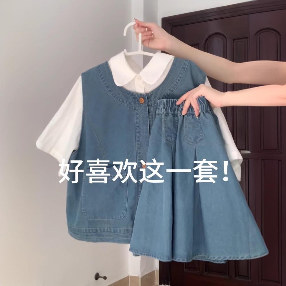 Set Denim Retro Musim Panas 2025 Rok Setengah Badan Terlihat Langsing Rompi Dipakai Bertumpuk Kecil Dua Set Elegan Mengurangi Usia Trendi