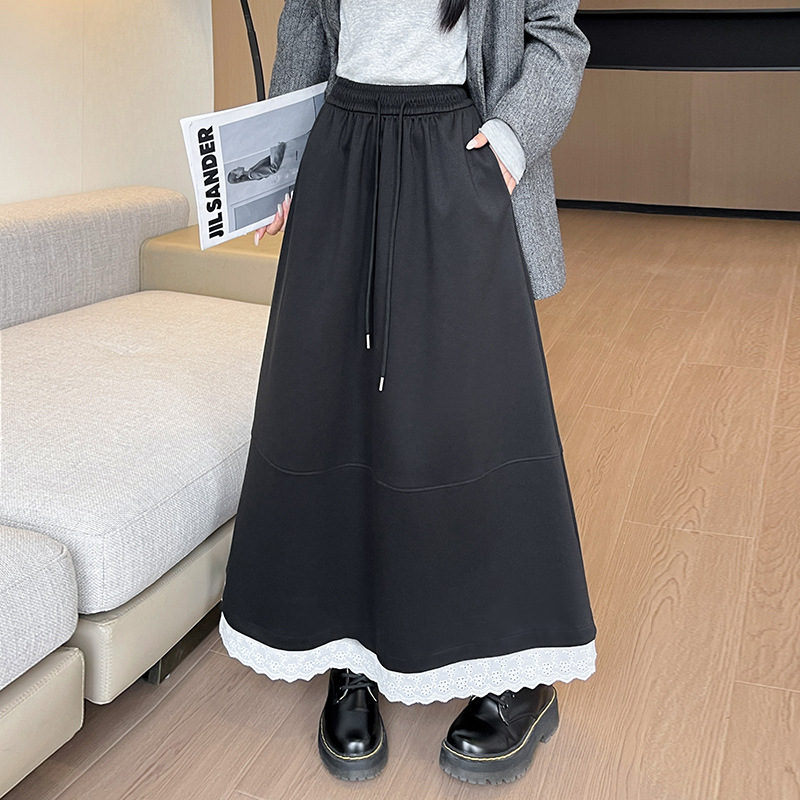 秋冬新款毛呢半身裙女蕾丝花边高腰显瘦a字大摆裙大码抽绳款裙子
