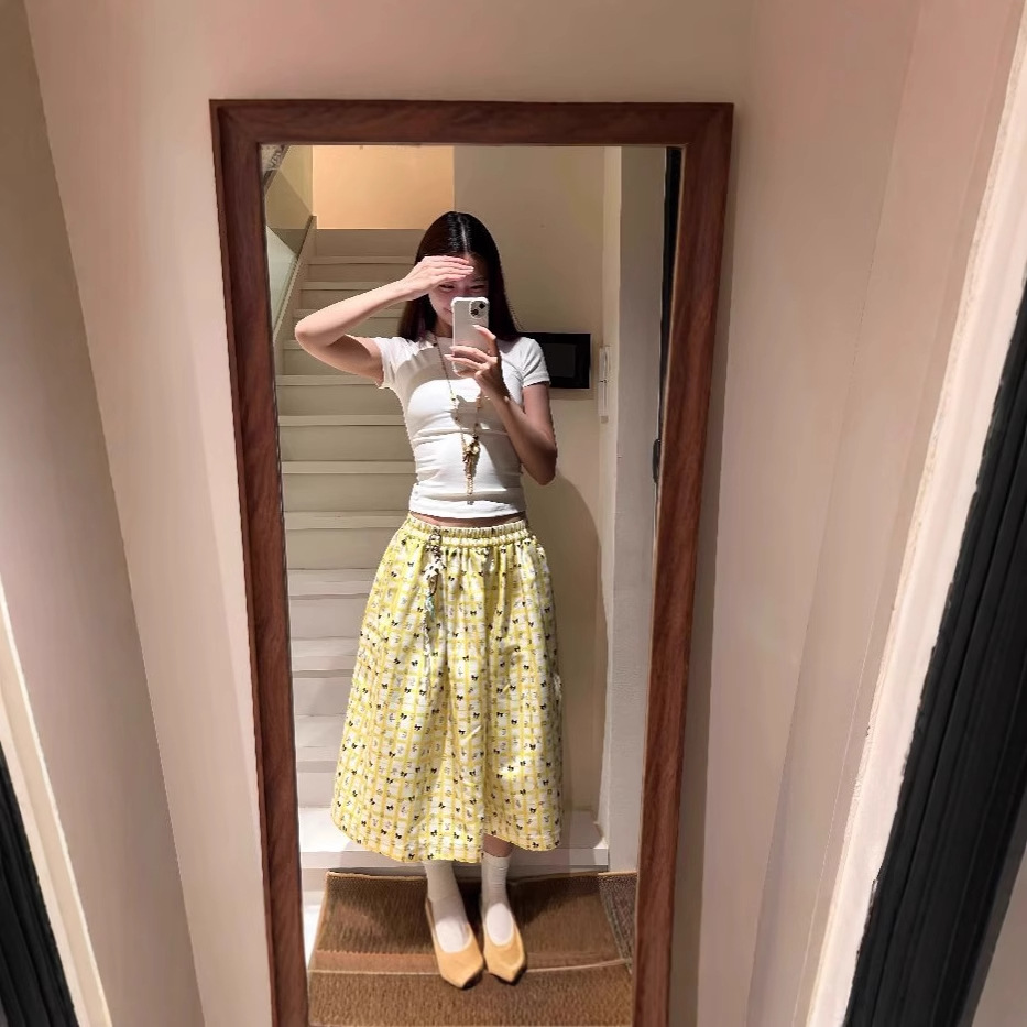 Rok Setengah Tubuh Longgar Ketat Pinggang Bercorak Motif Cetak Warna Kuning Musim Panas Sederhana Gaya Korea Musim Panas