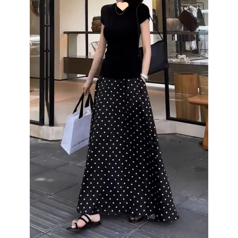 Rok Setengah Badan Pola-Dot Gaya Perancis Elegan Modis Rok Panjang Sedang Ukuran Besar Pinggang Tinggi Gemuk Terlihat Kurus Musim Panas Wanita